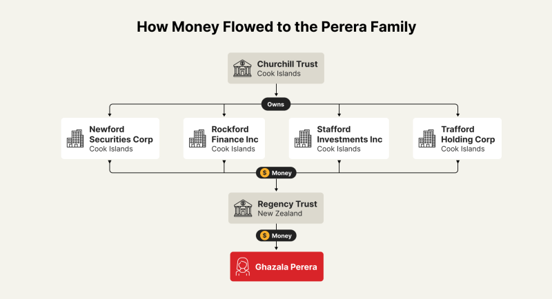 The leaked documents reveal that, on a single day in November 2009, $2.5 million was sent from the four shell companies in the Cook Islands to Regency Trust, of which Perera’s wife Ghazala was a beneficiary, according to loan agreements and contracts.