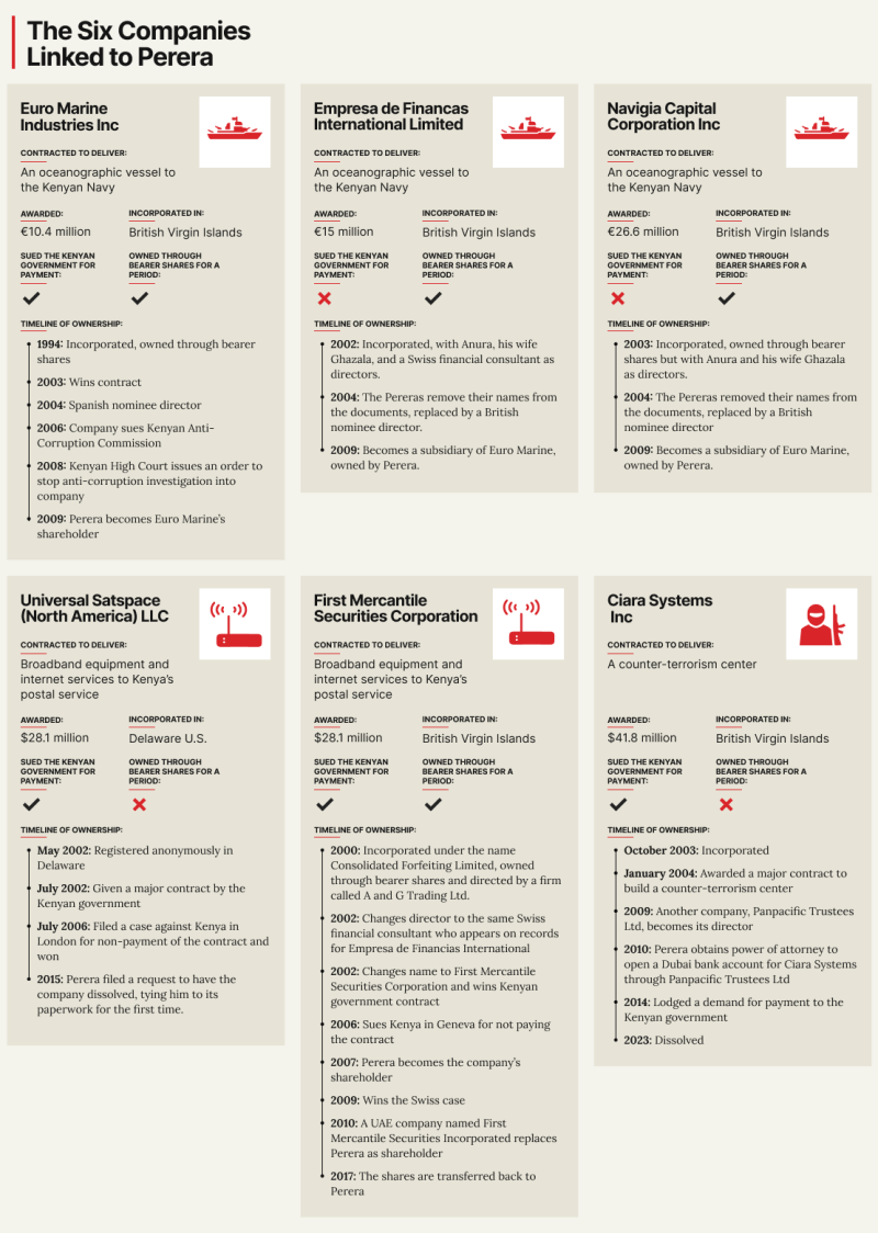 This happened as the Kenyan government was being forced to pay out huge sums of money to the offshore companies, by now linked to Perera — often in response to legal cases filed by these companies.