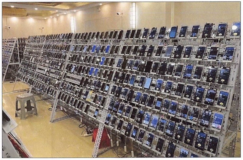 A “phone farm,” an automated call center used to carry out cryptocurrency investment scams, as shown in a U.S. indictment.