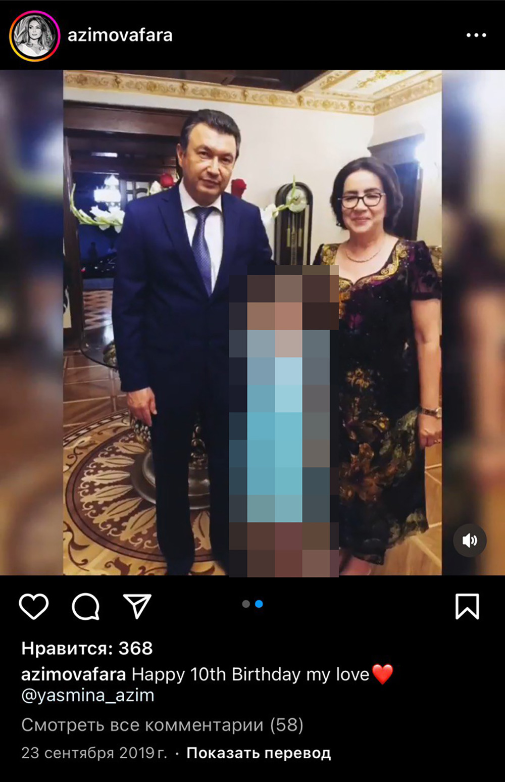 Azimova, who is reportedly a fashion designer, is married to Zafar Azimov, a businessman and son of former Tajik prime minister Yahyo Azimov. The younger Azimov co-owns a private equity firm that invests in manufacturing, real estate and healthcare in Russia, Tajikistan and the U.S.