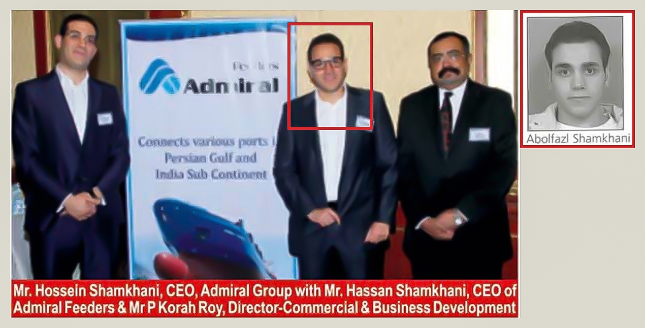 Left: A 2015 article from the Daily Shipping Times, an Indian trade publication, showing Abolfazl Shamkhani (second from right) – under the name “Hassan Shamkhani” – with his brother, Hossein Shamkhani (far left). Right: Abolfazl Shamkhani’s headshot from a 2006-07 yearbook for Lebanon American University in Beirut, where the brothers earned degrees.