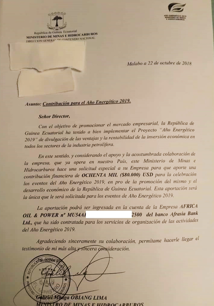 Una carta obtenida por Diario Rombe muestra como Africa Oil & Power puede haber sido empleada para ser depositaria de pagos extorsionados por el ministro. La carta, firmada con el nombre de Obiang Lima y dirigida a un destinatario cuyo nombre está oculto, pide que patrocine un evento llamado Año Energético de Guinea 2019 con 80.000 dólares, cantidad que debe depositar en una cuenta a nombre de Africa Oil & Power.