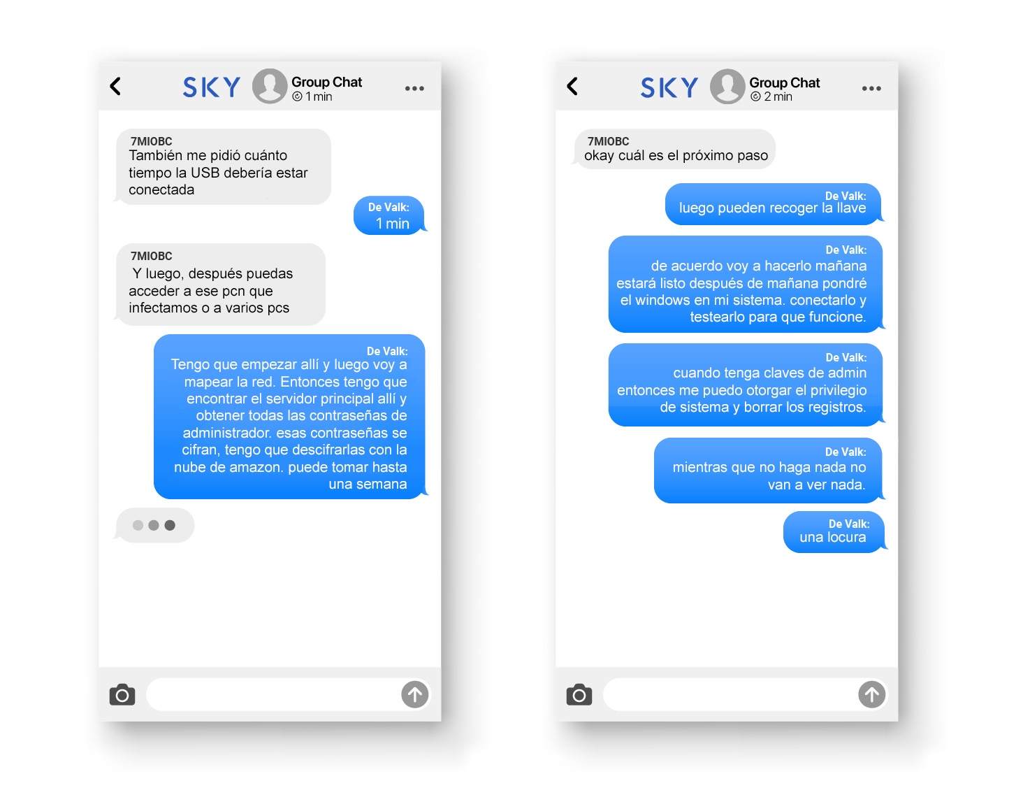 La empleada indicó a la policía belga que alguien se le acercó y le ofreció 10.000 euros por insertar una memoria USB en un computador en su lugar de trabajo. Después de aceptar, le dieron un teléfono SKY ––un dispositivo seguro con la aplicación de mensajería cifrada–– para comunicarse con un usuario de la cuenta SkyECC identificado en el tribunal sólo como 7MIOBC, quien compartió sus consultas en un chat grupal con De Valk y Zwaneveld.