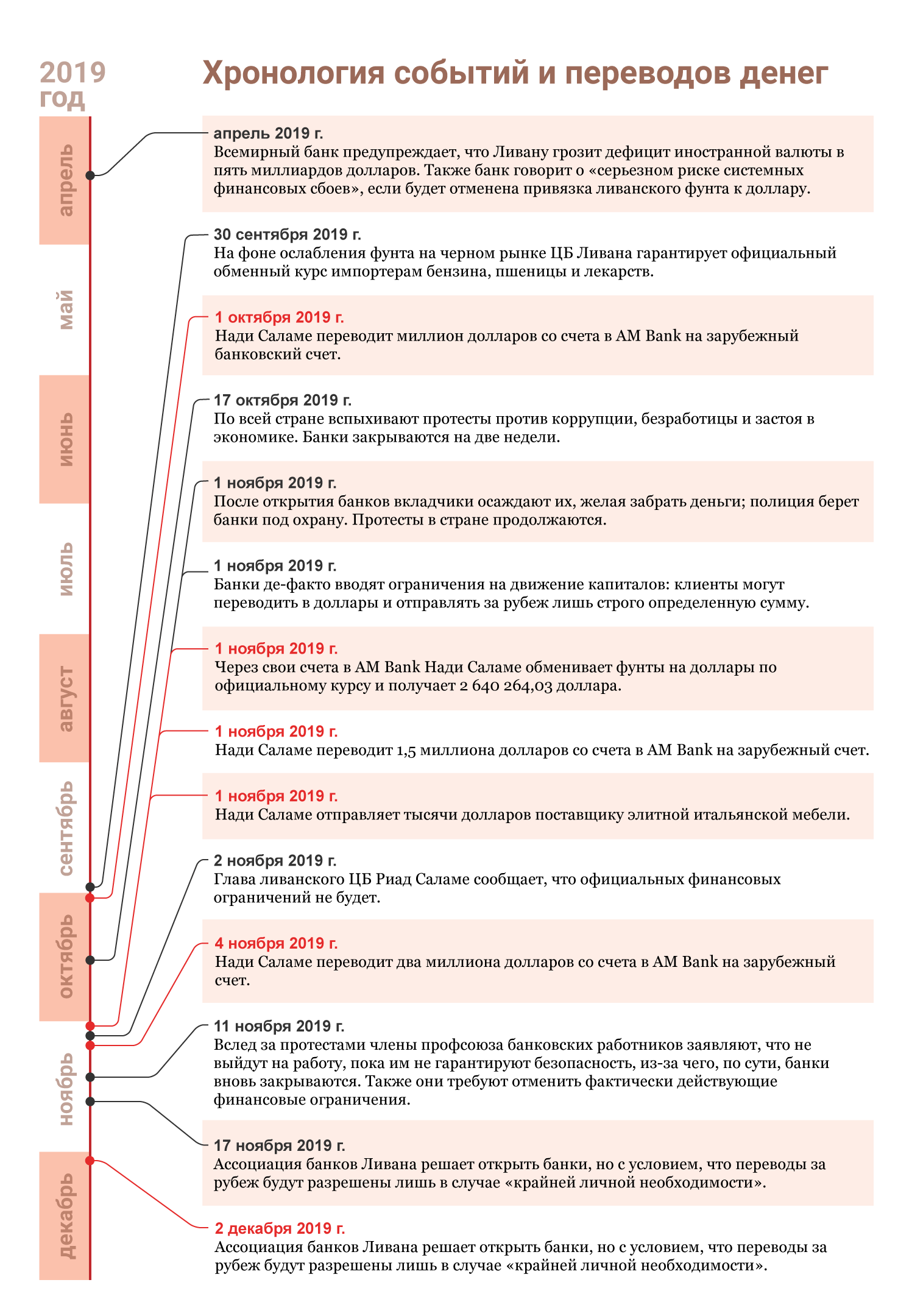 Первый трансферт в миллион долларов перевели с его счета 1 октября — за две с лишним недели до временного закрытия банков. Еще три транша на общую сумму 5,5 миллиона долларов отправили после того, как 1 ноября ливанские банки снова заработали.