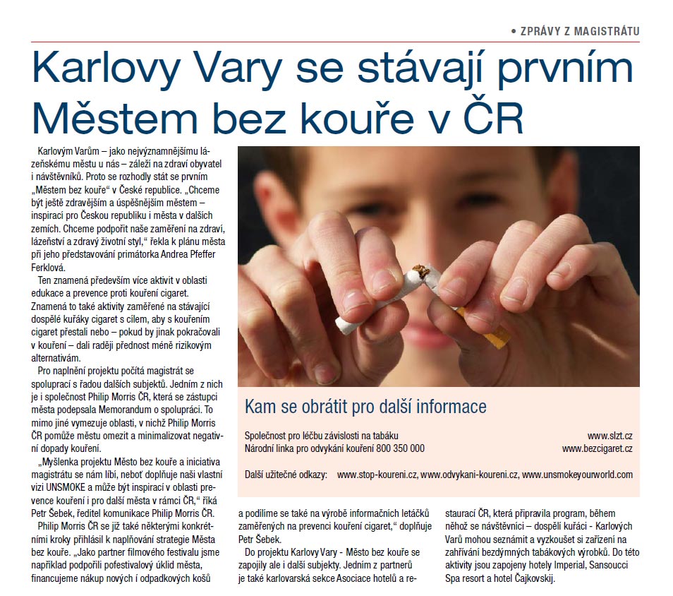 В мае 2019 года градоначальница подписала договор о сотрудничестве с чешским филиалом PMI, и Карловы Вары объявили «первым курортом Чехии без дыма». Через несколько месяцев табачная компания передала городскому совету почти 21 тысячу евро на утилизацию отходов и новые пепельницы.