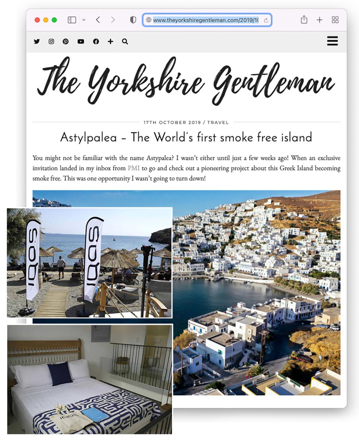 Блогер, известный как The Yorkshire Gentleman, пишущий о разных событиях и стиле жизни, был в оплаченной PMI поездке, целью которой было громко рассказать о новом, «бездымном», статусе Астипалеи. Он разместил фото с рекламой IQOS на пляже для некурящих, где побывал сам. Также он с восторгом написал о роскошном отеле, в который его поселила PMI, и не забыл упомянуть IQOS.