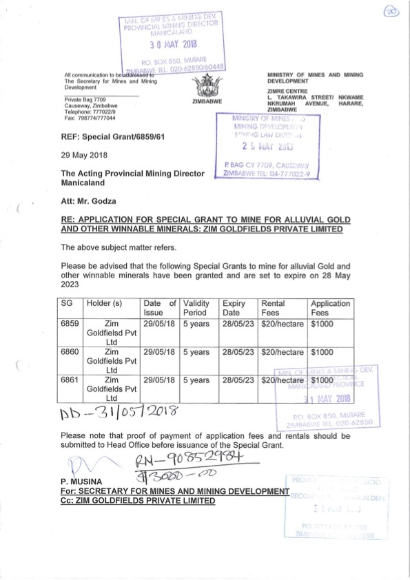 Zim Goldfields получила разрешения на разведку запасов золота на трех участках общей площадью почти 55 тысяч гектаров, в том числе у реки Мутаре в восточной части Зимбабве – ее название означает «река металлов». В мае 2018 года компании выдали пятилетний «специальный грант» на добычу золота в устье реки.