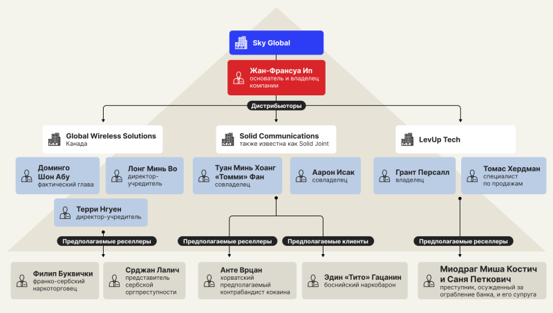 Несмотря на то что у Sky Global был сайт, до 2020 года купить онлайн его флагманский продукт Sky ECC было невозможно. Компания работала через многоуровневую сеть реселлеров, которыми управляли дистрибьюторские компании с неприметными названиями вроде Global Wireless Solutions, Global Wireless Consulting Services и LevUp Tech. По словам адвокатов Ипа, этих дистрибьюторов выбрали потому, что Ип знал о них еще по работе в телеком-отрасли.
